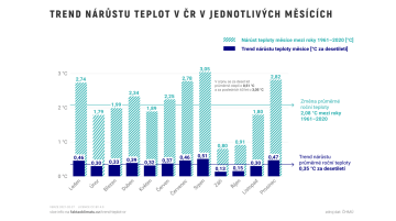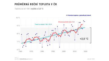 Stejně jako na celé planetě roste i v České republice počet teplých a extrémně teplých dnů a nocí. Průměrná teplota u nás se od poloviny 70. let minulého století zvýšila dokonce o 2 °C, roste tedy rychleji než globální. V průběhu roku nedochází k rovnoměrnému oteplování, nejvyšší nárůst zaznamenáváme v červenci a srpnu, v zimních měsících, ale také v dubnu. „V uplynulých pěti letech jsme navíc mohli být svědky největšího sucha za posledních 2 000 let, mezi nejvíce zasažené oblasti patří severní a jihozápadní Čechy, kde chybí až roční úhrn srážek,“ poukazuje na dopady oteplování u nás meteorolog Žák.